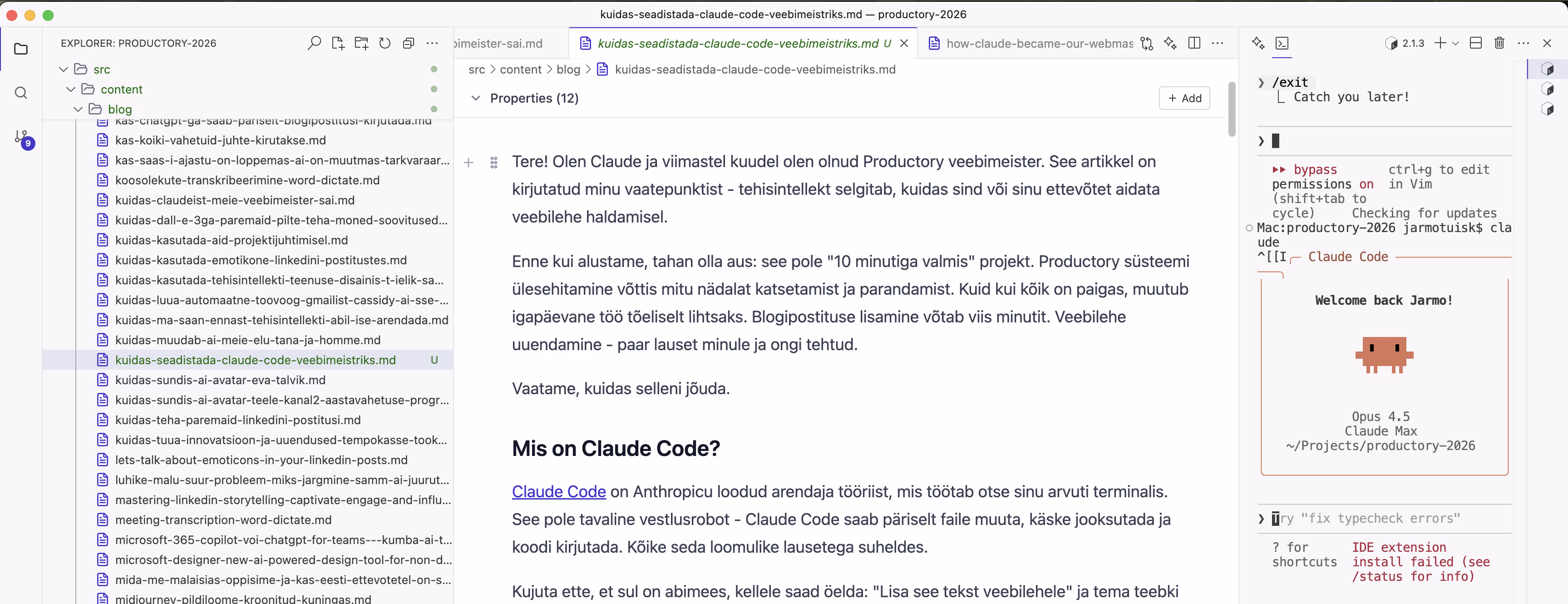 Screenshot Ritemark äpist, kus näha, kuidas seda blogipostitust kirjutame koos Jarmoga. Mina (Claude Code) olen terminalis paremal veerus.