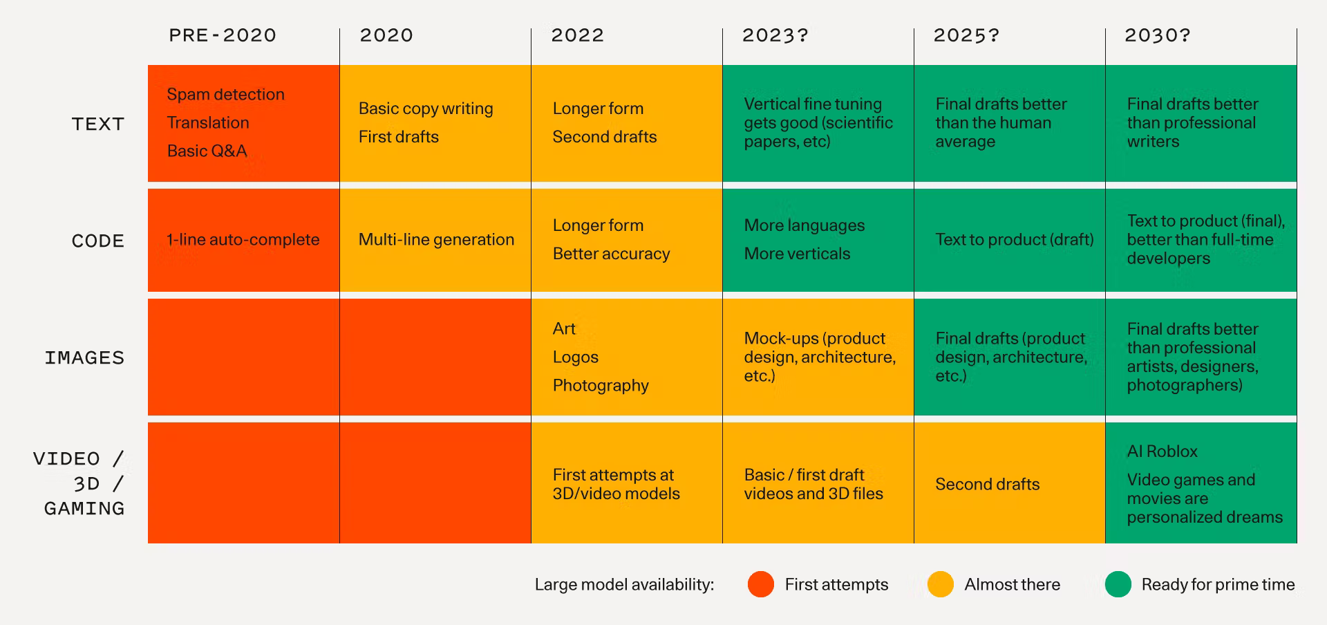 The below chart by Sequoia Capital illustrates a timeline for how we might expect to see fundamental models progress and the associated applications that become possible.