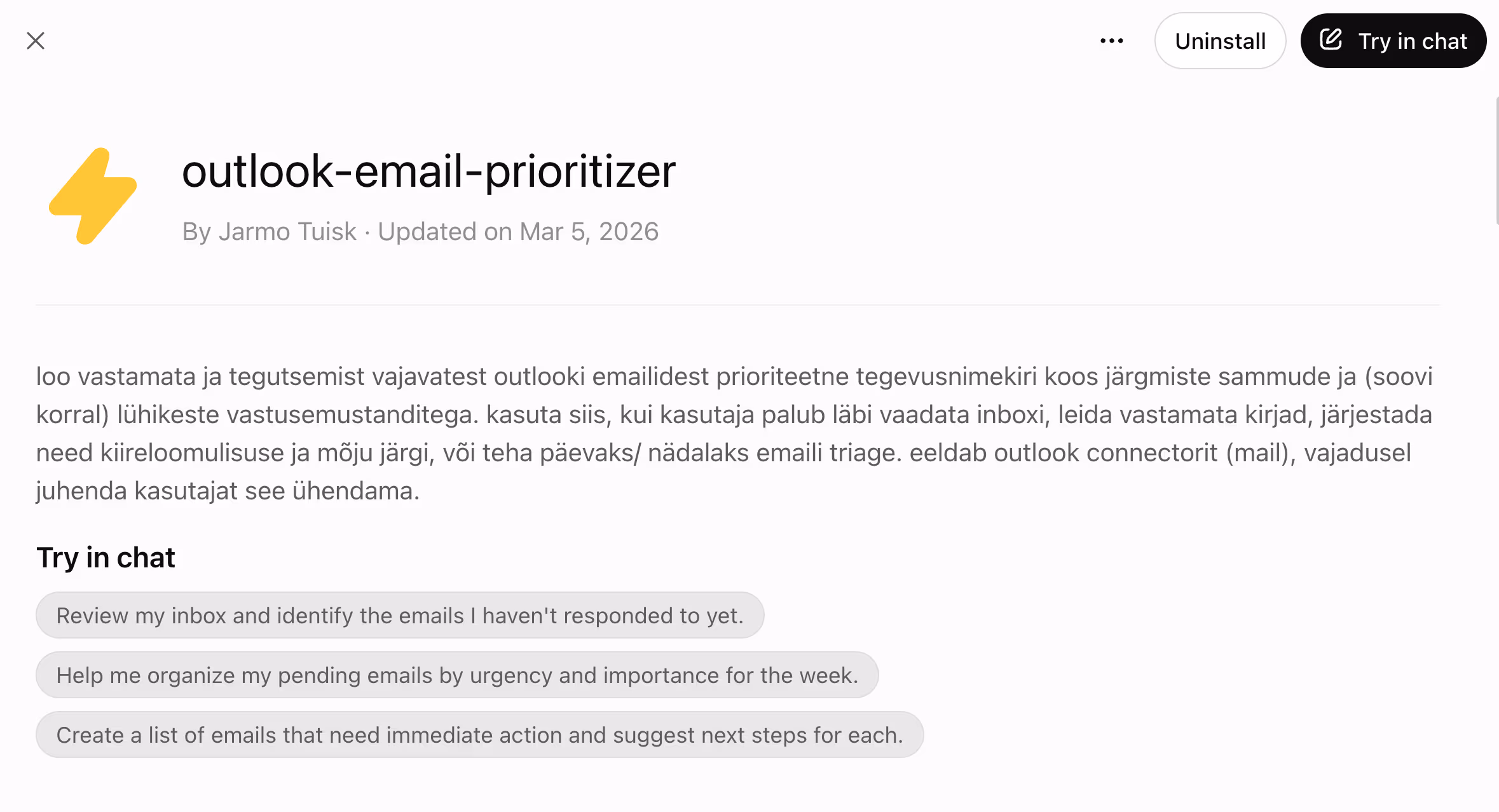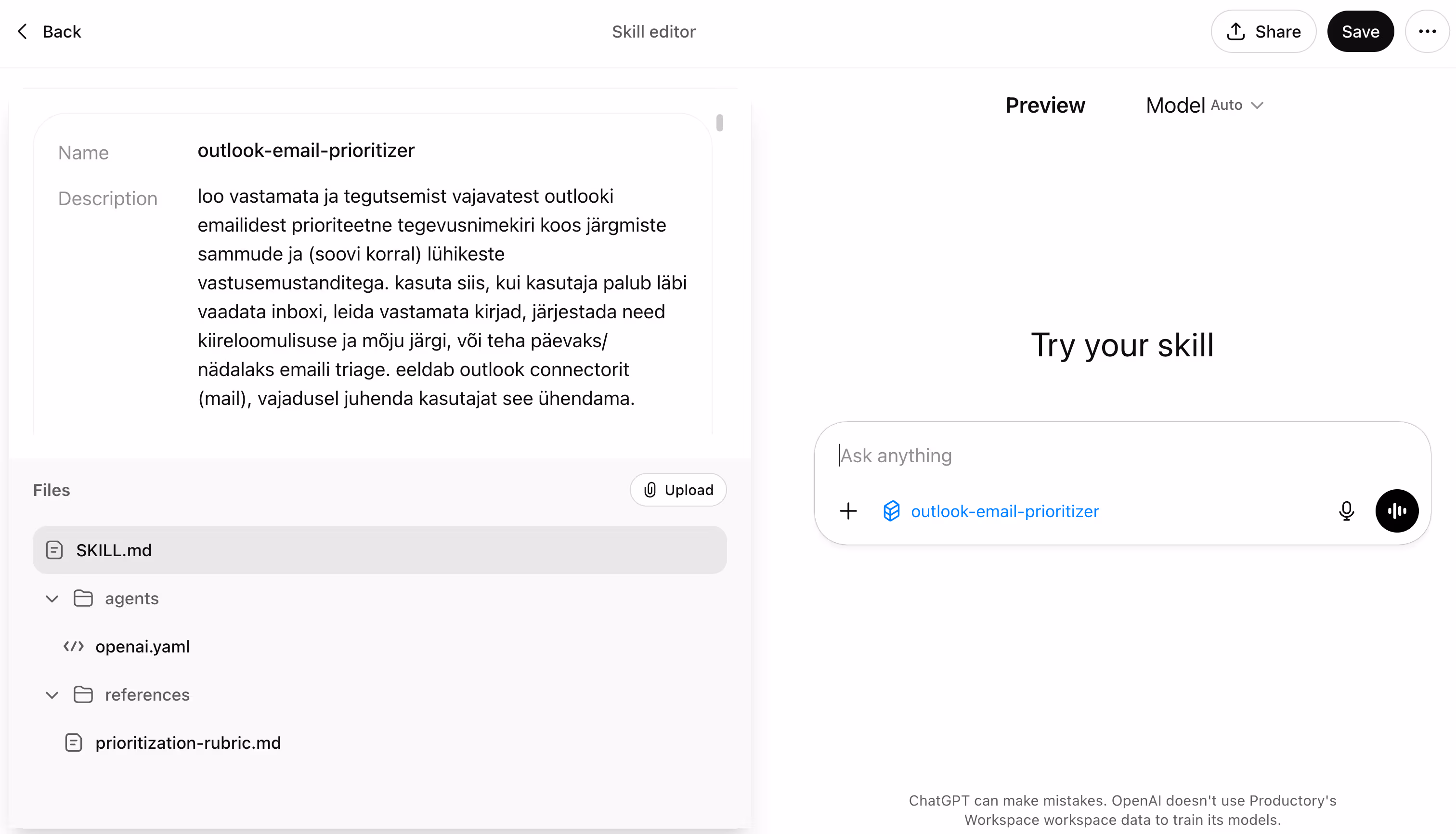 Kui see skill on installitud ja sa kopeerid ChatGPT-sse hulga e-kirju või ühendad Outlooki, hakkab ChatGPT automaatselt seda skilli kasutama — ilma, et peaksid iga kord ütlema "kasuta e-kirjade skilli". Ta lihtsalt teab.