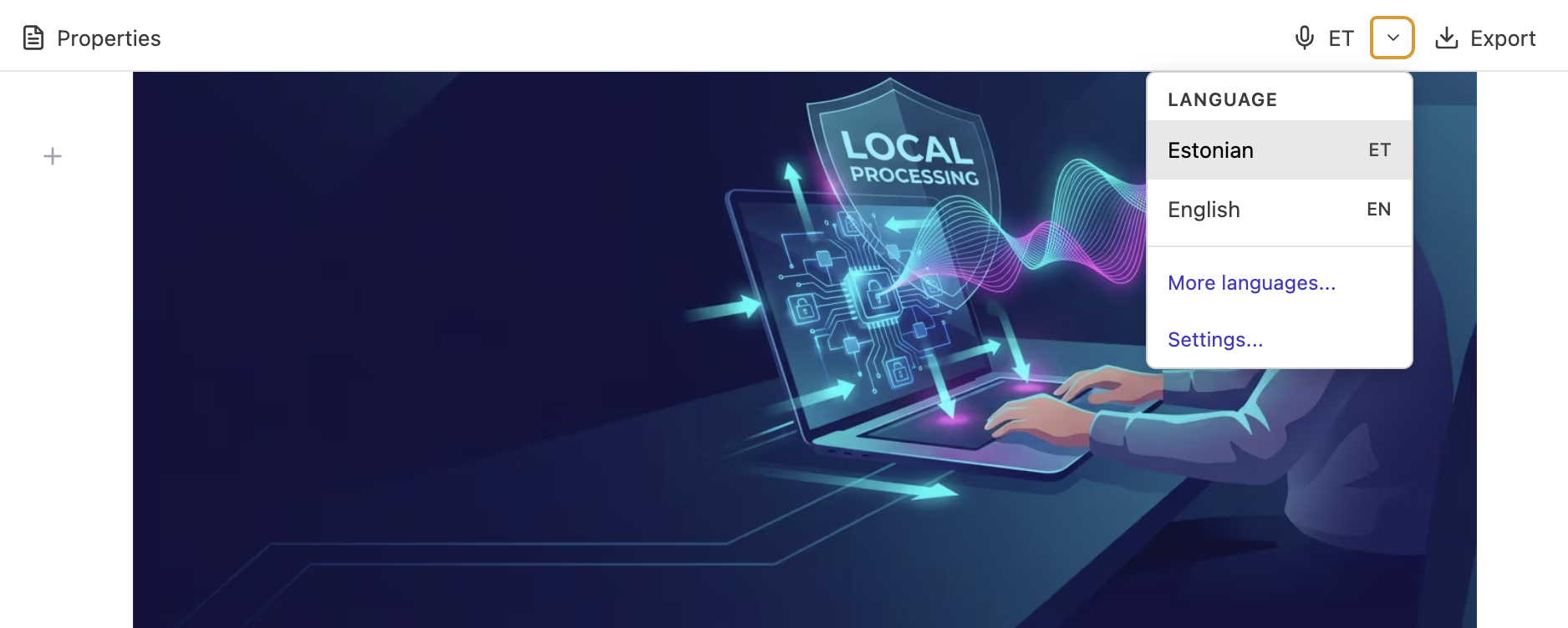 Beyond Estonian, the same model supports over 50 languages. Switch between them as needed — the model handles multiple languages without downloading additional files.